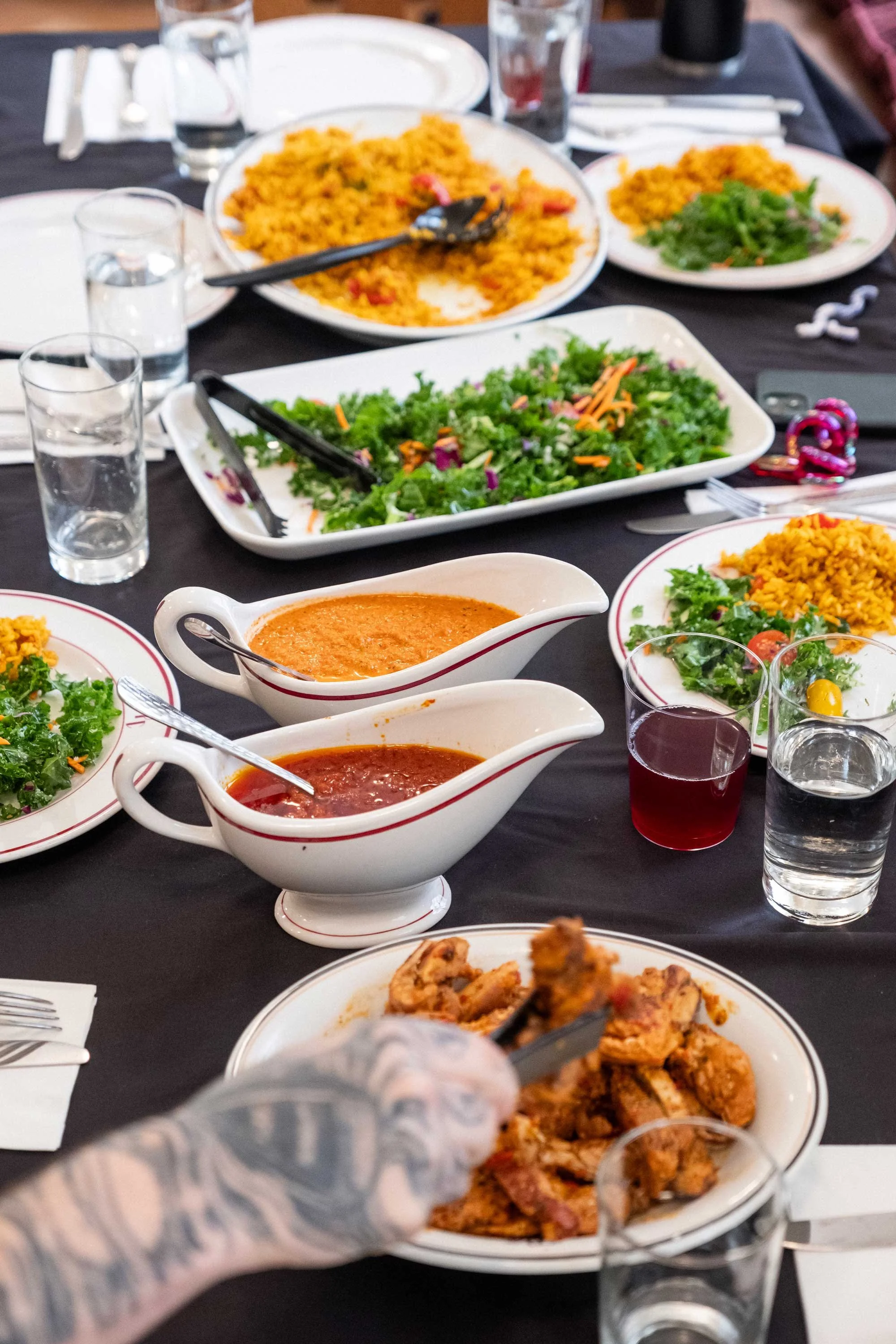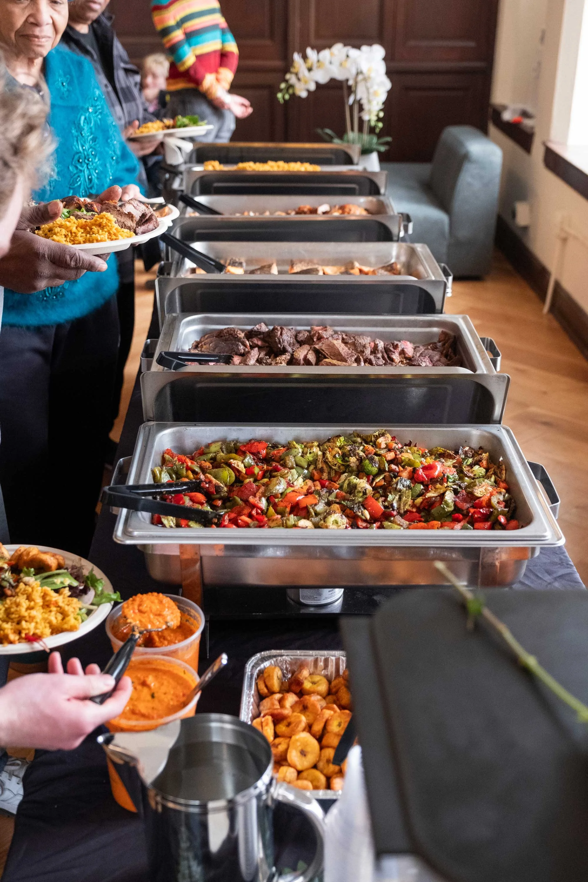 Sunday Rice is built on intention. Ingredients are sourced from local markets and African grocers across Chicago, and each gathering involves hours of preparation — marinating, blending spices, slow-cooking stews, and preparing sauces by hand.